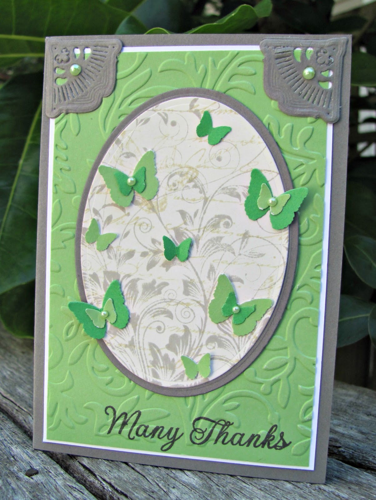 My card used three Hero Arts stamps. There are two on my oval. The background on is a collage stamp stamped in Antique Linen. The Leafy Vine is stamped in Wet Cement Shadow ink. The corners are a new Spellbinders die. Finished with A LOT of butterflies.