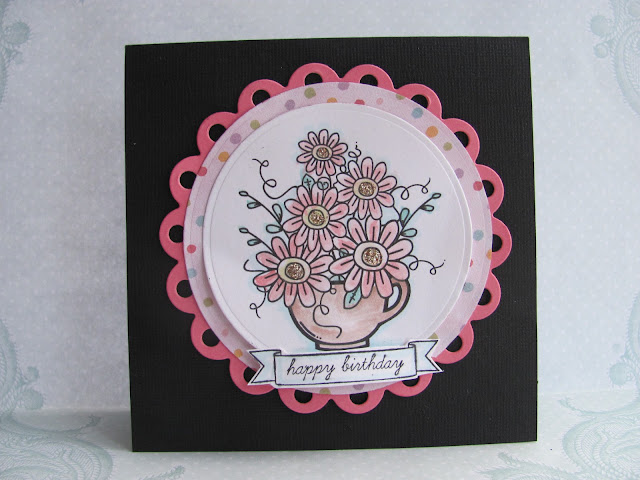 We were given some glitter card to stamp the image on as well as some gorgeous PP's. My drama..... I used the wrong ink... Archival black instead of Momento so when I went to start adding my Copics.... the ink bleed. YUCK... and because I didn't do my colouring till I got home.... due to me not reading my email correctly and didn't take my colouring medium with me to class! So there was NO more of the glitter card left.... and I really wanted to try this technique. So out came the JAC paper and my Diamond Dazzle glitter and I made my own piece. And stamped it with the right ink.... Here it is finished